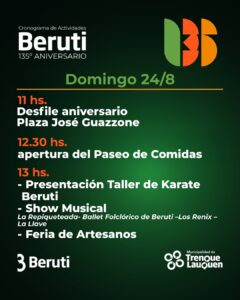 La comunidad de Beruti continúa con los festejos por su 135º aniversario, con un programa que incluye actividades culturales, artísticas, deportivas, recreativas y gastronómicas organizadas por la Delegación Municipal junto a instituciones de la localidad.