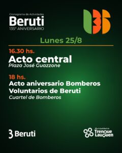 Posteriormente, a las 18, se desarrollará el acto aniversario de los Bomberos Voluntarios de Beruti en el cuartel de la institución.