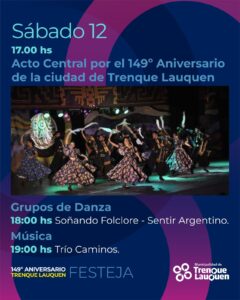 Con actividades artísticas impulsadas por instituciones y referentes de la cultura local continuarán hoy los festejos por el 149º aniversario de la fundación de la ciudad de Trenque Lauquen, que se extenderán durante todo el mes de abril.