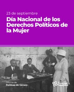 La Oficina de Políticas de Género del Municipio recuerda que cada 23 de septiembre se conmemora el “Día Nacional de los Derechos Políticos de la Mujer”, un hito fundamental que evoca la participación de las mujeres en la vida política y social, y que honra la lucha incansable de tantas mujeres que soñaron con una sociedad más justa e igualitaria.
