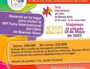 La Biblioteca Rivadavia, como cada año, suma su propuesta de visitar la Feria del Libro de Buenos Aires saliendo desde la terminal de Trenque Lauquen, el sábado 10 de mayo, a las 7 hs de la mañana para llegar al Predio de la Rural a visitar la feria a las 13:30hs.