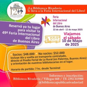 La Biblioteca Rivadavia, como cada año, suma su propuesta de visitar la Feria del Libro de Buenos Aires saliendo desde la terminal de Trenque Lauquen, el sábado10 de mayo, a las 7 hs de la mañana para llegar al Predio de la Rural a visitar la feria a las 13:30hs.
