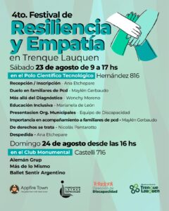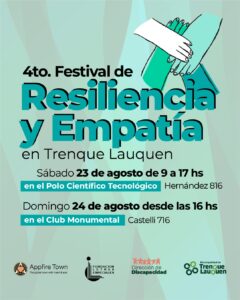 El sábado 23 y domingo 24 de agosto se realizará en Trenque Lauquen el 4º Festival de Resiliencia y Empatía que contará con múltiples actividades que se desarrollarán en instalaciones del Polo Científico Tecnológico Municipal (Hernández nº 816) y en el Club Monumental (Castelli nº 716), con entrada libre y gratuita para toda la comunidad.