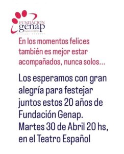 Fundación Genap invita a toda la comunidad a festejar con alegría sus 20 años, hoy a las 20hs en el Teatro Español.