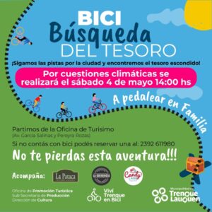 La “Bici Búsqueda del Tesoro”, que organiza la oficina de Promoción Turística del Municipio, se adelantó para mañana sábado debido a los pronósticos de lluvia y mal tiempo para el domingo, en el que iba a realizarse la actividad que está pensada para compartir y disfrutar en familia.
