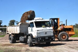 La tosca –un estabilizado granular que se utiliza como base para el asfalto– se coloca con maquinaria municipal: una motoniveladora retira una capa de 15 centímetros de tierra que se reemplaza por este material, luego se distribuye y compacta para garantizar firmeza y durabilidad en futuras etapas de pavimentación.