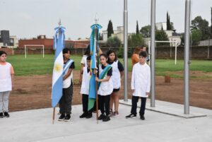 El acto se desarrolló en el patio de la institución educativa, sobre el playón realizado a nuevo como parte de la obra integral, en lo que marcó el regreso de los docentes y alumnos/as a la escuela que fue afectada por un incendio primero y luego por un temporal y que fue refaccionada en su totalidad por el Municipio, con recursos municipales y financiamiento del Fondo de Infraestructura Escolar (PET), de la provincia de Buenos Aires. La inauguración formal de la obra se concretará próximamente en fecha a confirmar a la espera del arribo de las autoridades provinciales a la ciudad.