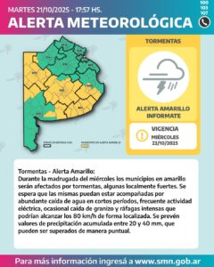 El Servicio Meteorológico Nacional emitió una alerta amarilla por tormentas para hoy miércoles. Según el informe, “el área será afectada por tormentas, algunas localmente fuertes. Se espera que las mismas puedan estar acompañadas por abundante caída de agua en cortos períodos, frecuente actividad eléctrica, granizo y ráfagas intensas que podrían alcanzar los 80 km/h”.