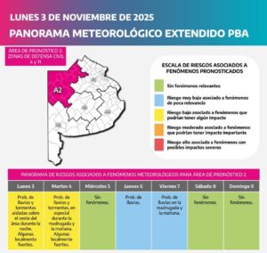 De acuerdo al reporte, “el área será afectada por tormentas de variada intensidad, algunas localmente fuertes. Las mismas podrán provocar abundante caída de agua en cortos períodos, intensas ráfagas que pueden alcanzar localmente los 70 km/h, actividad eléctrica frecuente y ocasional caída granizo”.
