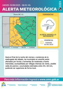 El Servicio Meteorológico Nacional (SMN) emitió en las últimas horas una alerta amarilla para la tarde del hoy y durante el sábado, que afectará a todo el oeste de la provincia de Buenos Aires.