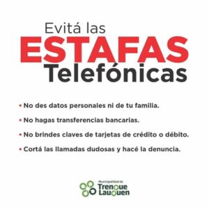 Ante la continuidad de los llamados telefónicos a los vecinos del distrito de Trenque Lauquen por presuntas estafas que persisten en estos días, el Área de Vacunación Municipal recuerda que NO se están comunicando con la población para otorgar turnos de vacunación.