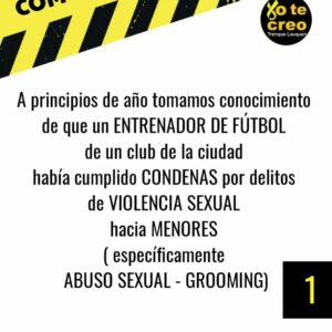 La Agrupación “Yo Te Creo” que trabaja en la defensa y contención de las víctimas de la violencia de género y junto a sus familias difundió un informe para recordar que se había emitido una alerta sobre la actividad de un entrenador deportivo que tiene denuncias por abuso sexual y ya cumplió condenas por ese delito y grooming; y quien sigue ejerciendo ese rol en una institución de nuestro medio y tiene menores de edad a cargo.