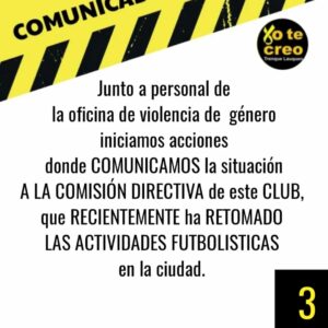 “Desde la Oficina de Violencia de Género se comunicaron con el club y ahora el entrenador retomó funciones, alertamos al club y luego de tres meses sigue al frente del grupo de chicos, decidimos hacerlo público porque las familias deben conocer esta situación”, se dice en el comunicado.