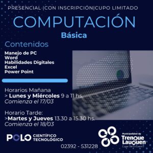 Contenidos: manejo de PC, Word, Habilidades digitales, Excel, Power Point. Presencia con inscripción previa. Cupos limitados. Comienza el lunes 17 de marzo. Horarios mañana: lunes y miércoles de 9 a 11. Horarios tarde: martes y jueves de 13.30 a 15.30.