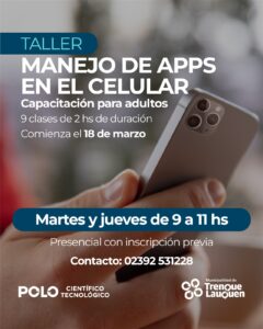 Capacitación para adultos, de 9 clases de dos horas de duración. Comienza el 18 de marzo y se dictará los martes y jueves de 9 a 11. Es presencial y requiere inscripción previa.