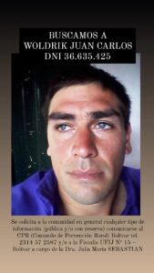 Por medio de la presente C.P.R local solicita colaboración a la comunidad Trenquelauquense para dar con el paradero del ciudadano WOLDRIK JUAN CARLOS, ARGENTINO, INSTRUIDO, DNI 36.635.245, DE 29 AÑOS DE EDAD, SOLTERO, desaparecido el día 30 de Marzo del corriente año.