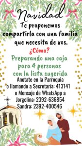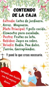 Los organizadores indicaron que cada caja para ayudar a las familias deberá contener como entrada latas de jardinera, arroz y mayonesa; como plato principal, un pollo cocido y alimentos para ensalada; como postre, frutas en lata, bebidas como jugos en sobre y para el brindis budín, pan dulce, turrón y garrapiñadas. Además, se le puede agregar lo que la familia considere necesario y una tarjeta con los mejores deseos.
