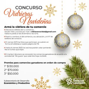 Como en años anteriores y con el objetivo de celebrar la Navidad y promocionar el comercio local, la subsecretaría de Desarrollo Económico y Productivo del Municipio, a cargo de Germán Lauro, lanza una nueva edición del Concurso “Vidrieras Navideñas” mediante el cual se invita a los comerciantes del distrito a decorar el frente/vidriera de sus locales con adornos navideños y enviar una foto al correo electrónico: vidrierasnavidad@gmail.com