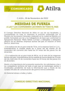 - Un paro total de 48 horas en el resto de las empresas lácteas del país, desde las 0 del miércoles 30 de noviembre hasta las 24 horas del jueves 1° de diciembre.