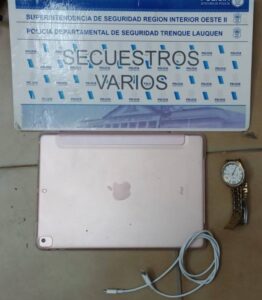 Al requisarlo, los agentes encontraron en su poder un reloj marca Citizen bañado en oro con incrustaciones de diamantes y una mochila que contenía una tablet iPad color rosa de Apple. Estos elementos habían sido robados horas antes de una vivienda ubicada en calle Di Gerónimo, donde desconocidos ingresaron tras forzar un ventiluz durante la ausencia de los moradores.