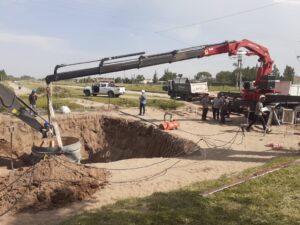La municipalidad de Trenque Lauquen avanza con la obra del Colector Cloacal Sur, que fue adjudicada a la empresa constructora AGM mediante Licitación Pública, y que se está desarrollado por etapas, habiéndose concretado el montaje de la Estación de Bombeo nº 1, en Batallón 2 de Infantería y Regimiento Tres de Caballería.