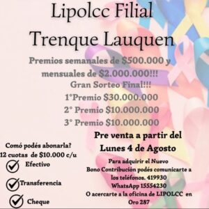 A partir del lunes 4, la Liga Popular de Lucha contra el Cáncer (LIPOLCC) pondrá en circulación su tradicional bono solidario, un mes antes de lo habitual. Con un costo de $120.000 pagaderos en 12 cuotas de $10.000, los bonos estarán a la venta mediante vendedores acreditados con credencial municipal y de LIPOLCC. También en la sede de calle Oro 287 (atención de 8 a 14 hs) o vía telefónica al 419930 o 15554230.
