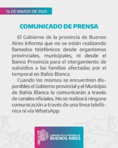 A través de un comunicado, con intención de evitar estafas en el marco de una situación tan grave, aseguraron que cuando haya una línea de subsidios los gobiernos provincial y municipal lo informarán a través de canales oficiales y no a través de WhatsApp. De igual modo, subrayaron que el Banco Provincia no está realizando este tipo de ofrecimientos.