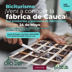 El próximo viernes 24 desde las 14hs se realizará otra jornada de Biciturismo pensada para todos aquellos/as que quieran conocer la fábrica de Cauca, sus productos y procesos de fabricación, en una nueva propuesta de la oficina de Promoción Turística del Municipio.