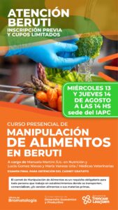 Como parte del programa de actividades por el 135º aniversario de Beruti, el área de Bromatología municipal dará un curso presencial de Manipulación Segura de Alimentos el miércoles 13 y jueves 14 de agosto a partir de las 14 en instalaciones del Instituto Agrotécnico Padre Castellaro –IAPC-.