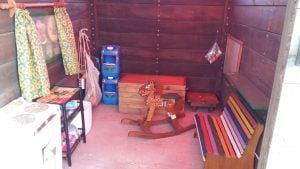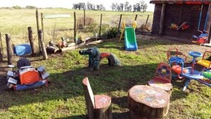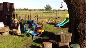 La placita, que está en el campo ubicado en la zona rural de Martín Fierro, cuenta con una casita para que jueguen los niños “que la hice de un box que me quedó de una petisa que teníamos en el haras”, hamacas, arenero, bancos y una mesita hechos con troncos y otros juegos, todos fabricados de manera artesanal y pintados por Patricia.