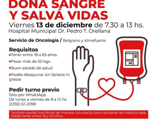 Sociedad Posted on9 diciembre, 2024 COLECTA ANUAL DE SANGRE: SERÁ EL PRÓXIMO VIERNES Y LOS INTERESADOS/AS DEBEN SACAR TURNO PREVIAMENTE