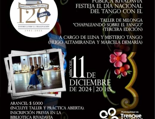 Sociedad Posted on9 diciembre, 2024 LA BIBLIOTECA RIVADAVIA FESTEJA EL DÍA NACIONAL DEL TANGO ESTE MIÉRCOLES 11 CON UN TALLER DE MILONGA Y UN BAILE ABIERTO A TODO PÚBLICO.