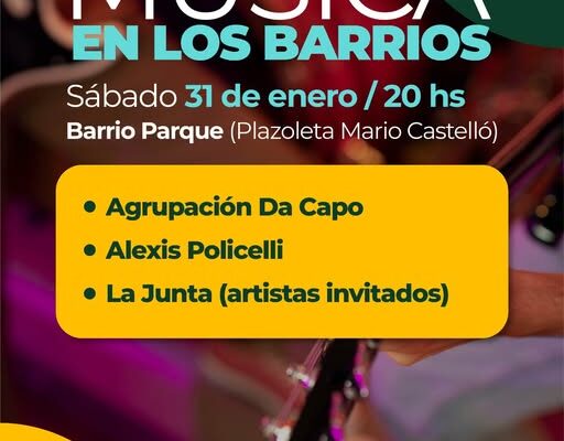 Sociedad Posted on27 enero, 2026 MÚSICA EN LOS BARRIOS: LA SEGUNDA FECHA SERÁ ESTE SÁBADO (31) EN LA PLAZOLETA MARIO CASTELLÓ, EN BARRIO PARQUE