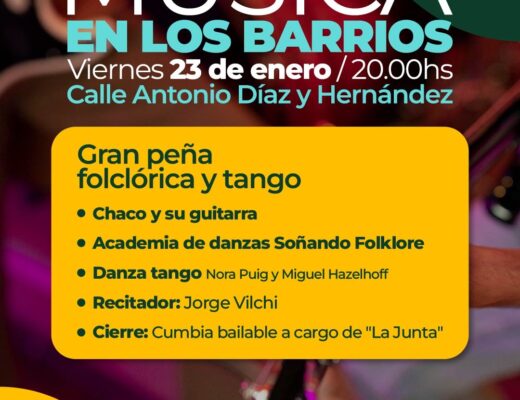 Sociedad Posted on20 enero, 2026 VUELVE ESTE VIERNES MÚSICA EN LOS BARRIOS: LLEGA AL COMPLEJO “MARÍA CASTAÑA” CON UNA GRAN PEÑA DE FOLCLORE Y TANGO