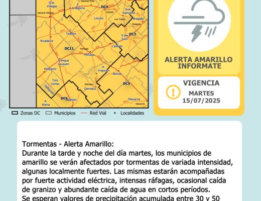 Sociedad Posted on14 julio, 2025 MARTES: ALERTA AMARILLA POR TORMENTAS PARA TRENQUE Y GRAN PARTE DE LA PROVINCIA DE BUENOS AIRES