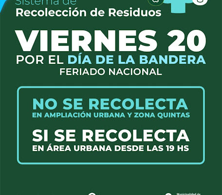 Sociedad Posted on18 junio, 2025 POR EL FERIADO NACIONAL DEL DÍA DE LA BANDERA, ESTE VIERNES SOLO HABRÁ RECOLECCIÓN DE RESIDUOS EN EL ÁREA URBANA