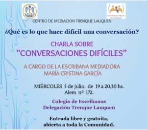 El Centro de Mediación de Trenque Lauquen organiza una charla sobre “Conversaciones difíciles” dictada por la Escribana Mediadora Cristina García.