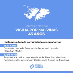 Las actividades continuarán esta noche (martes) con una Vigilia por Malvinas que partirá a las 21.30 desde la Estación del Ferrocarril, por la avenida Villegas, hasta la Plaza San Martín, donde a partir de las 22 habrá presentaciones artísticas de la Banda Municipal Luis Perego, que dirige José Luis Villaro; del actor y director Javier Bories; del Cearte; el actor Martín Urbaneja, integrantes del Centro de Escritores Domingo Cicoria, y la agrupación Almatian, entre otras propuestas.