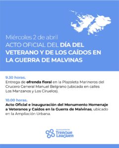 El acto contará con la presencia de los veteranos de guerra de Malvinas de Trenque Lauquen y veteranos territoriales, el intendente Francisco Recoulat, autoridades, representantes de instituciones, agrupaciones locales, y la comunidad en general.