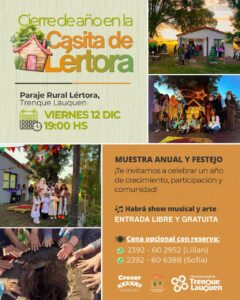 El próximo viernes (12) a partir de las 19 se realizará el cierre de año en la Casita de Lértora, un encuentro para compartir y conocer las producciones de los talleres anuales, y disfrutar de una jornada con propuestas culturales, artísticas y recreativas.