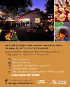 Durante el encuentro habrá Feria Navideña, Pesebre Viviente, exposición de Cerámica Ancestral, Coreografía de Zumba y un show musical a cargo de David Ibáñez junto a “Peña La Junta”, ofreciendo un repertorio variado que incluirá folclore, chamamé, cumbia y otras propuestas musicales tradicionales. La agrupación incorporará acordeón y distintos ritmos festivos para acompañar la jornada y brindar un cierre cálido y participativo.