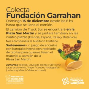 Mañana desde las 8 en Plaza San Martín y en las cuatro plazas de la ciudad: Francia, España, Italia y Británica, se realizará una colecta de papel y tapitas, entre otros elementos reciclables, para la Fundación Garrahan, en una actividad conjunta del Programa de Reciclado y Medio Ambiente de la Fundación Garrahan y la Municipalidad de Trenque Lauquen, con la colaboración de Auditorio Cristiano.
