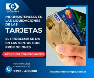 Desde la Cámara de Comercio, Industria y Servicios de Trenque Lauquen queremos poner en conocimiento de nuestros asociados que se han detectado inconsistencias en las liquidaciones de las ventas con promociones de las tarjetas. Recomendamos a los comerciantes analizar las liquidaciones de las tarjetas para no sufrir distorsiones en sus movimientos.