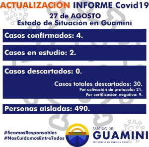 La Municipalidad de Guaminí publicó esta mañana una actualización del reporte de salud por Covid-19 confirmando dos casos más positivos y elevando el número de vecinos aislados a 490.