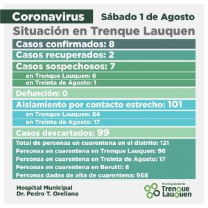 Hay 101 personas en aislamiento por contacto estrecho, 84 en Trenque Lauquen y 17 en Treinta de Agosto, y 121 en cuarentena en todo el distrito: 96 en Trenque Lauquen, 17 en Treinta de Agosto y ocho (8) en Berutti, asimismo 968 obtuvieron el alta de esa condición.