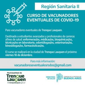 Este viernes tendrá lugar en nuestra ciudad el curso de vacunadores eventuales de Covid-19 que organizan Región Sanitaria II, dependiente del ministerio de Salud de la provincia de Buenos Aires, y la municipalidad de Trenque Lauquen.
