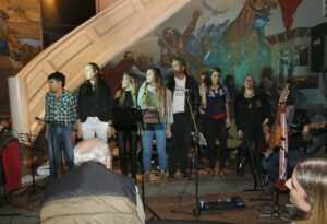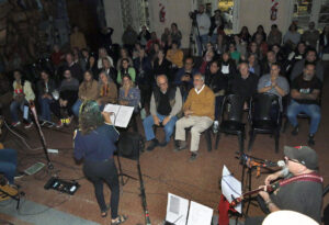 Seis cantantes (Carolina Santos, Florencia Villalba, Marichi García, Roberto Maiza, Gustavo Bomar y Juanjo Estévez), cinco músicos (Mauro Caracotche, en batería; Andrés Fonterosa, en armónica; Leandro Perucca, en bajo; Juanjo Estévez, en guitarra y charango; y Orlando Moro, en guitarra y coros) y una docena de bellas canciones unieron en su armoniosa recorrida algo del folclore y rock nacional y de la música centroamericana y pegaron directamente en el corazón de un auditorio –asistió el intendente Miguel Fernández- que devolvió lo recibido con el sincero premio del aplauso. El sonido corrió por cuenta de Bruno García.