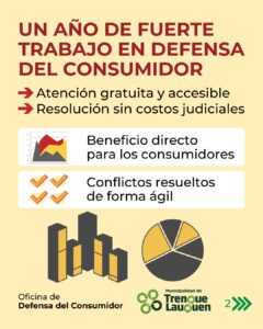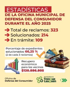 La Oficina Municipal de Defensa del Consumidor, que funciona en el primer piso del Centro Cívico (Oro y Villegas) cerró el año 2025 con un intenso trabajo en la atención y resolución de reclamos, reflejado en más de 320 expedientes tramitados a lo largo del período.