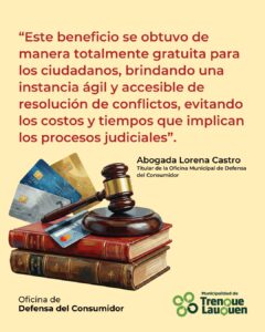 “Este beneficio se obtuvo de manera totalmente gratuita para los ciudadanos, brindando una instancia ágil y accesible de resolución de conflictos, evitando los costos y tiempos que implican los procesos judiciales”, señaló la titular de la Oficina de Defensa del Consumidor, Lorena Castro.