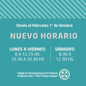 El Colegio de Farmacéuticos de Trenque Lauquen informa que a partir del miércoles 1º de octubre las farmacias tendrán un nuevo esquema horario de atención: